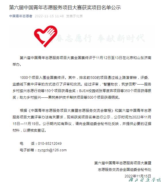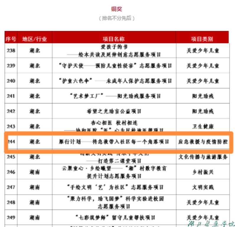 本网讯(通讯员 盛宝玉 孙小虎)近日,第六届中国青年志愿服务项目大赛全国赛终评于11月12日至13日在北京和山东济南顺利举办,在全国赛综评中,湖北医药学院第一临床学院“彩虹”灾害医学救援志愿服务队“雁行计划--将急救带入社区每一个角落”项目成功斩获“铜奖”。