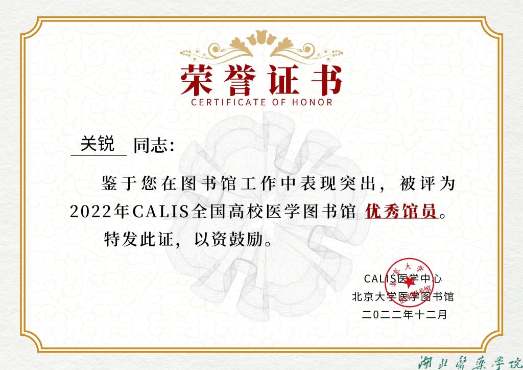 本网讯(通讯员 帅晓静)日前,在CALIS全国医学文献信息中心/北京大学医学图书馆首次启动的CALIS高校医学图书馆优秀馆长和优秀馆员的评选中,湖北医药学员图书馆关锐同志荣获2022年CALIS高校医学图书馆优秀馆员称号。