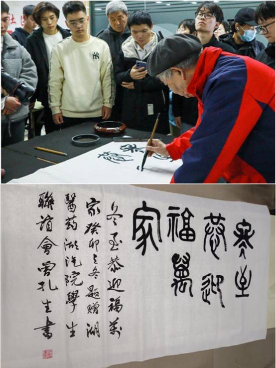 本网讯(通讯员 王能俊 徐娟 张飞扬)为了加强校际交流,丰富同学们的大学生活,提高对书画的兴趣,12月2号下午,我校书画协会与湖北汽车工业学院书画协会的在精术社区举行“冬至送福”联谊活动。我校离退休老师曾孔生、李加芙、胡承江、赵家祥等书画爱好者受邀参加,湖北汽车学院校团委实践与社团工作部副主任李旭,湖北医药学院校团委副书记邱爽,两校书画协会学生100余人参加了本次活动。