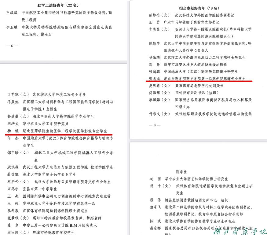 本网讯(通讯员 钟骅)近日,共青团湖北省委公布了2023年“湖北向上向善好青年”名单,我校生物医学工程学院医学影像专业学生杨帆、第一临床学院麻醉专业学生贺志成光荣上榜,分获“勤学上进好青年”和“担当奉献好青年”荣誉称号。