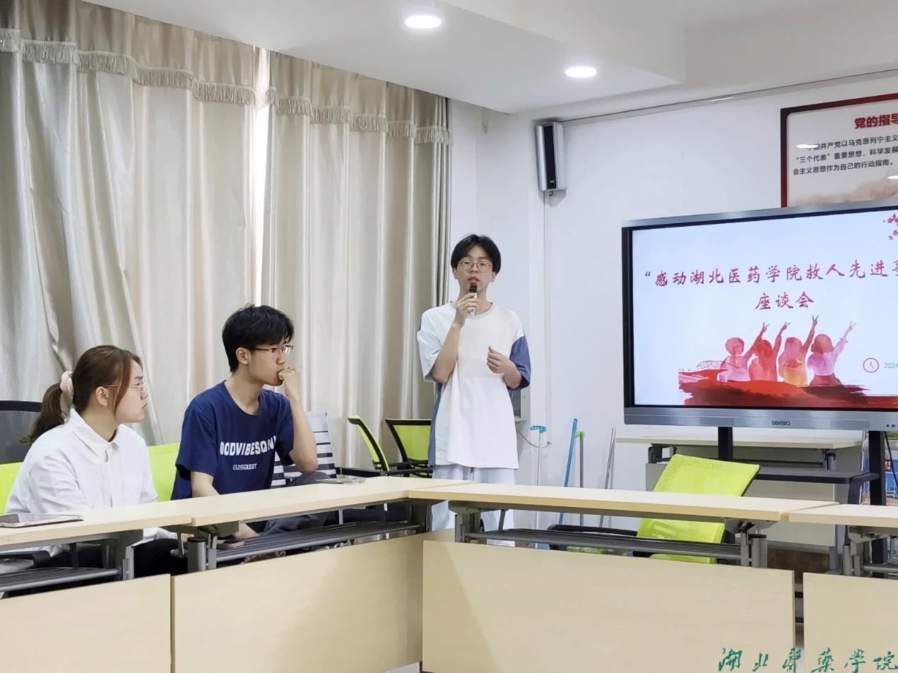 本网讯(通讯员 陈梦君 沈锐)为弘扬湖医药“好人文化”,增强社会正能量,2024年5月15日,湖北医药学院护理学院周丽急救志愿服务队在8号楼8413活动室召开“感动湖北医药学院”救人先进事迹座谈会。此次座谈会邀请了药护2020级涉外护本班高康和2020级涉外护本班王政文、陶奕分享他们在列车上救人的故事和施救经验及感悟。护理学院兼职分团委副书记沈锐主持。