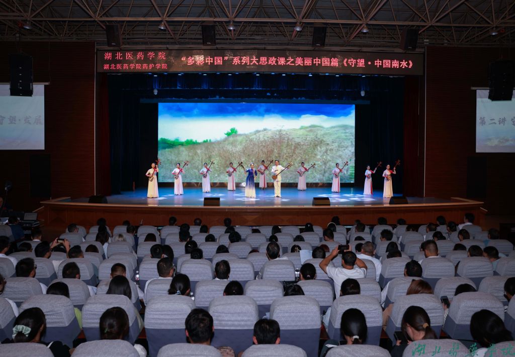 除去感人至深的故事外,这堂大思政课还结合舞蹈、民族乐器、情景歌舞、合唱等诸多元素,让以往枯燥的思政课堂顿时鲜活有新意,也让思政教育润物无声、入脑入心。在《如水倾城》舞蹈节目中,宛如江鹭般翩然入场的舞者们用曼妙质朴的舞姿勾勒出人与自然和谐相处的美丽图景;来自郧西县地方传统文化保护中心的工作者为师生带来了郧西三弦《丹水橘香》,演奏曲调优美,并结合十堰地域方言,兼具说唱歌舞,展现了南水北调水源核心区独特的地域文化和人文风情;在情景歌舞《一江深情》中,师生们演绎的库区移民,舍小家为大家,远离故土时捧一捧泥土寄托思乡之情,只为响应国家号召,顺利实现南水北调项目的故事,让观众感动万分。此时,女声独唱的清亮嗓音更烘托出气氛的高潮;最后,大合唱《和光同尘》中合唱队手捧月亮灯盏静步走上课堂舞台时,它们清亮温柔的歌声,如同真正在夜晚的江面上响起一般,随着明月映照的光亮,唱出声声“和光同尘”,唱出守护丹江口库区每位志愿者的点滴奉献。
