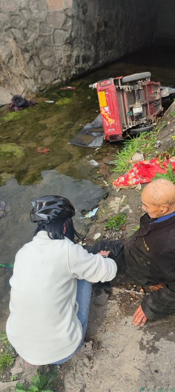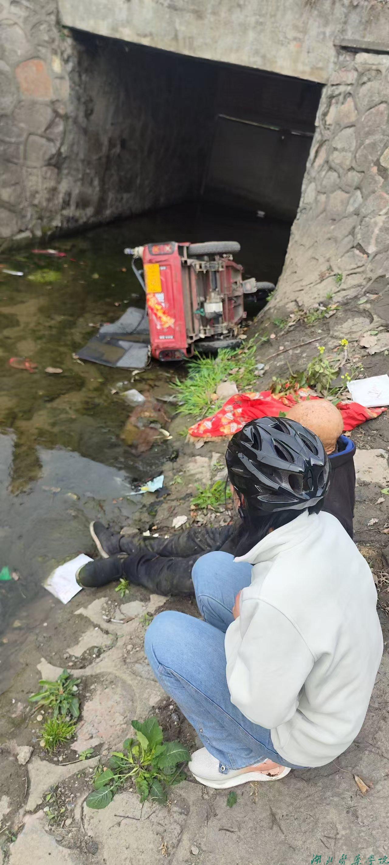 据了解,当天上午10点半左右,第四临床学院襄阳校区实习调休的学生王艳和刘丰羽,正在户外骑行锻炼身体,突然看到路边一名村民焦急挥手喊着救人。他们立即停下车子跟随村民前往查看,发现一位老爷爷连同三轮车从约3米高的小桥翻入沟中,情况十分危急。