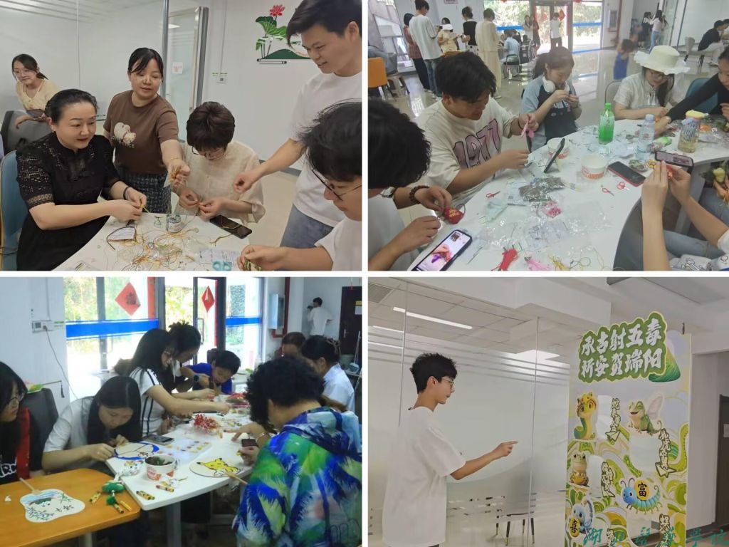 活动现场,师生们挑选布料、填充艾草、穿针引线,制作一个个造型精巧、香气清幽的的花草香囊;通过参与“射五毒”活动,共同领略古人驱邪避疫的智慧,感受古人祈求平安健康的美好愿望;在团扇制作区域,师生们在团扇上画出栩栩如生的粽子、龙舟等,或者用干花进行粘贴创作,使团扇充分展现出自然之美。师生们还用五彩绳编织纳福手绳。