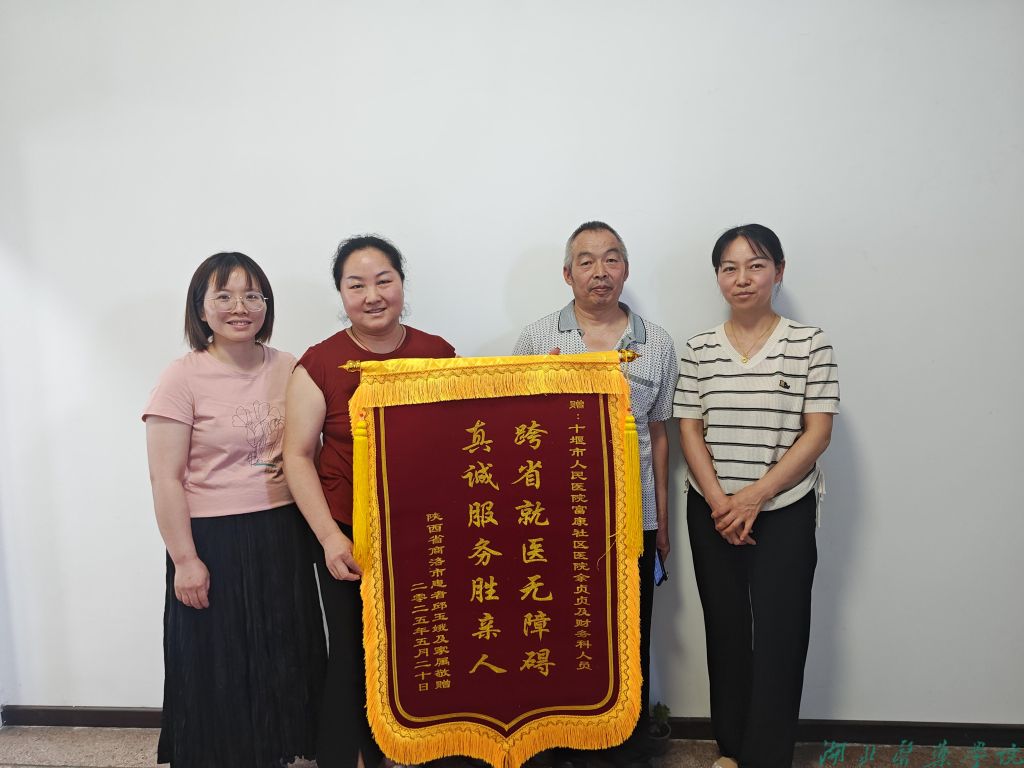 本网讯(通讯员 徐光姣)近日,富康社区医院收到了一份特殊的礼物——来自陕西省商洛市的患者邱女士(化名)及家属送来的两面锦旗,锦旗“以病人为中心,以服务树信誉”“跨省就医无障碍,真诚服务胜亲人”的字句,分别表达对血液净化科医护团队的感激和对异地就医医疗保障成果的肯定。