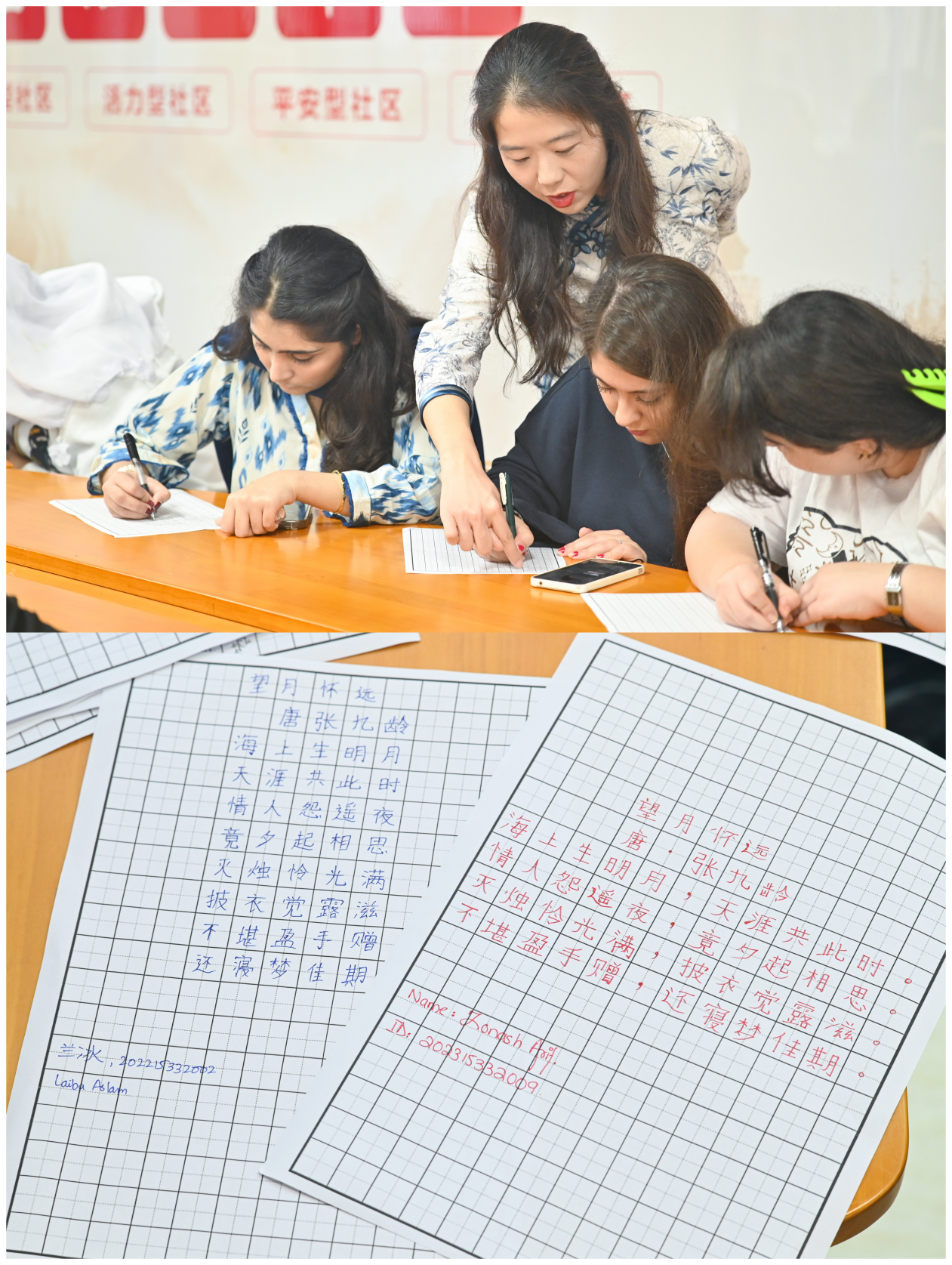 诗词互动环节,两名留学生代表登台,分别诵读《静夜思》《十五夜望月》,字正腔圆的朗读传递出诗词中的思乡情与中秋意,获现场师生阵阵掌声。随后的诗词书写环节,大家以笔寄情,专注书写《望月怀远》,在横竖撇捺间体悟中国诗词与书法的融合之美。不少留学生的书法作品笔法工整、韵味十足。