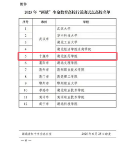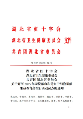 本网讯(通讯员 张玉萌)近日,湖北省红十字会、省卫健委、团省委联合发布通知,公布了2025年“无偿献血和造血干细胞生命教育高校行活动”试点单位名单。经严格评审,我校成功入选,成为全省12所试点高校之一。