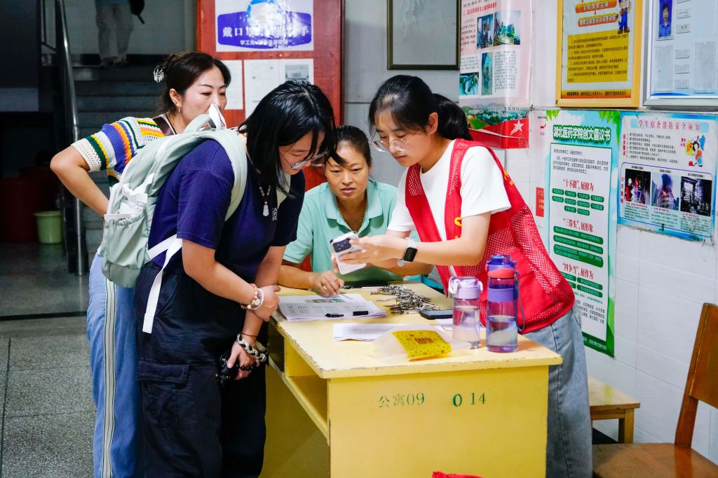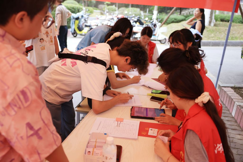 为保障校本部迎新工作,校团委招募三类志愿者:254名“杏林红”青春领航志愿者、172名校内志愿者及144名校外志愿者。其中,“杏林红”志愿者依托前期专题培训成果,沿用“1+2+N”志愿帮扶模式,以1名志愿者对接2个新生寝室的方式,从报到指引、行李搬运到校园生活答疑、学习规划分享,为新生提供“入学时-入学后”衔接服务,用朋辈力量帮助新生快速适应;校内外志愿者则分赴火车站、高铁站、校园各报到点及宿舍区,或举牌接站、协助登记,或引导新生完成色觉检查、校园卡激活,或配合AI数字人“湖小医”解答咨询,用穿梭的“红马甲”织就校园暖心风景线。