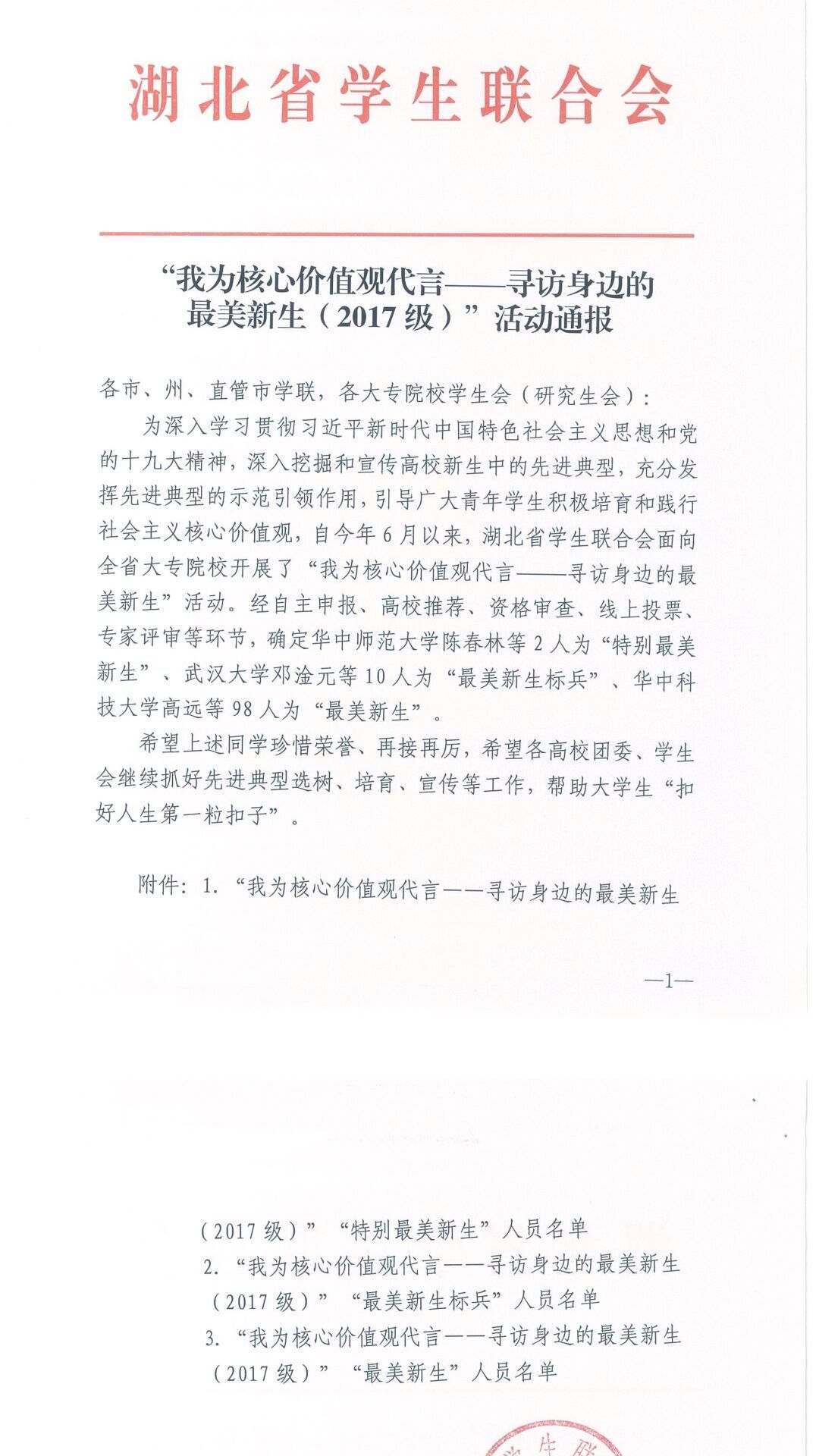 本次活动旨在寻找在热爱祖国、勤奋学习、科技创新、志愿服务、见义勇为、诚信友善、孝老爱亲、自强自立等方面表现突出的2017级学生。经过微博宣传,微信公众号的报名投票,各个学院分别推荐了1到2名学生到学校中,经过学校的考察与筛选,李丹等同学脱颖而出,代表学校接受省级的选拔,在重重选拔中,李丹同学最终得到了认可,获得“最美新生”的荣誉。