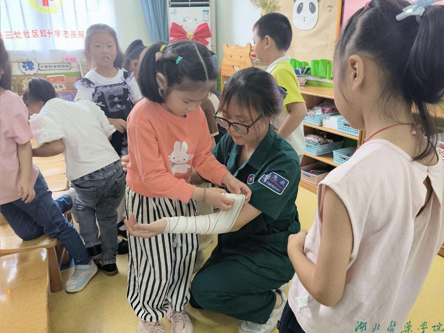 在急救技能展示环节,队员们进行了心肺复苏、海姆立克、创伤包扎这些实用的实操演示。活动现场,孩子们聚精会神、积极互动,在问答环节踊跃提出“心肺复苏要按哪个位置”“包扎能不能太紧”等问题,队员一一耐心解答并示范纠正。在志愿者的引导下,孩子们还亲自体验了急救操作,通过反复练习逐渐掌握基本动作要领,不仅学习了急救知识,也树立了互助友爱、敢于施救的责任意识。