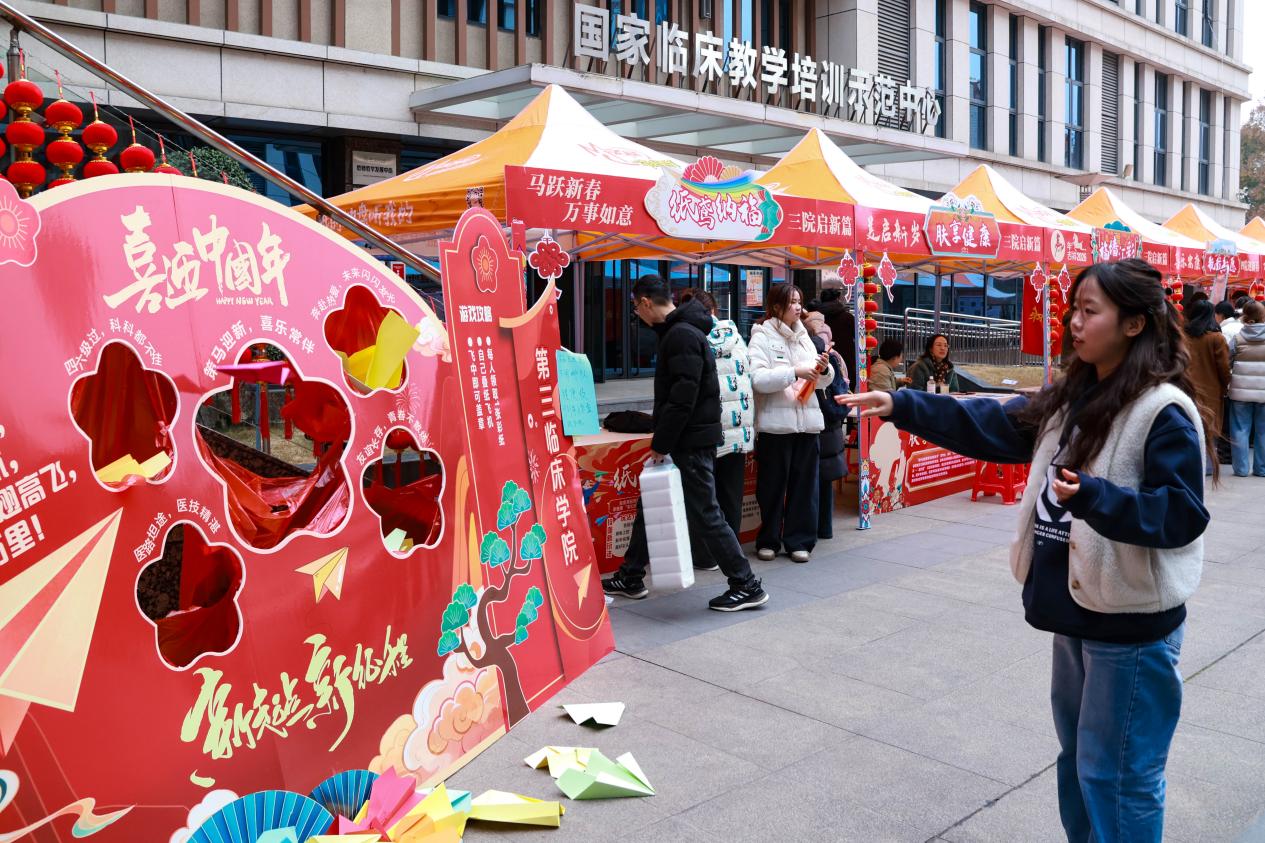 本网讯(文图/学通社记者 任娇 何晓雪 农珧 孙艺菲)12月30日下午,我校校园内欢声笑语、喜气洋洋。在我校庆元旦、迎新年第二届“杏林喜夜”嘉年华活动现场,一条以“六秩风华,万象更新”为主题的特色文化街精彩亮相。千余名师生齐聚于此,在非遗制作、游戏互动、特色服务、美食品尝、祝福书写等年味满满的跨年体验项目中,共同迎接元旦佳节的到来。