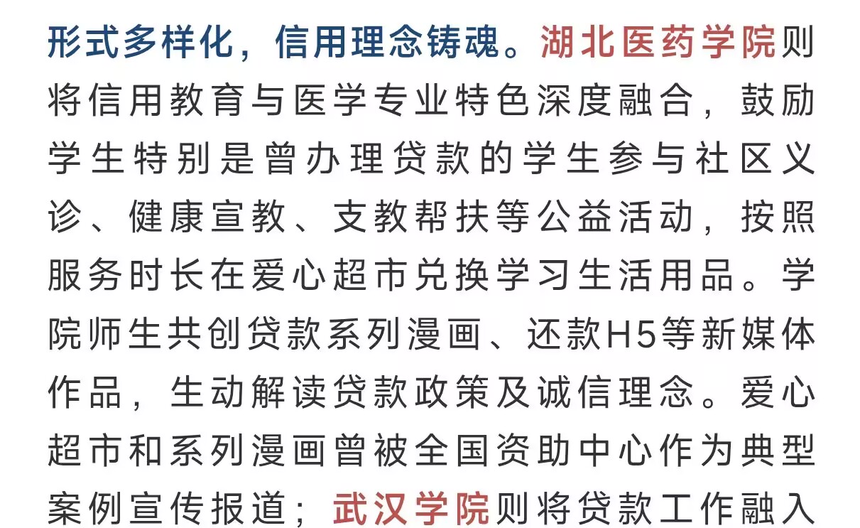 生源地助学贷款“医科特色实践”成为全省标杆。学校将诚信教育与大医品德、志愿奉献深度融合,打造“政策宣讲+信用培育+实践赋能”三维助学贷款工作体系。依托智慧资助平台优化流程,实现贷款申请、信息核对、回执录入提醒全流程数字化,让学生“少跑腿、好办事”;注重宣传形式的创新,师生共创贷款系列漫画、还款H5等新媒体作品,生动解读贷款政策及诚信理念;打造“信用+奉献”的育人模式,鼓励贷款学生参与社区义诊、健康宣教、支教帮扶等实践活动,按服务时长可在爱心超市免费兑换学习生活用品,既强化了学生的诚信意识,又彰显了医学生的责任担当。爱心超市和资助漫画曾多次被全国资助中心作为典型案例宣传报道。