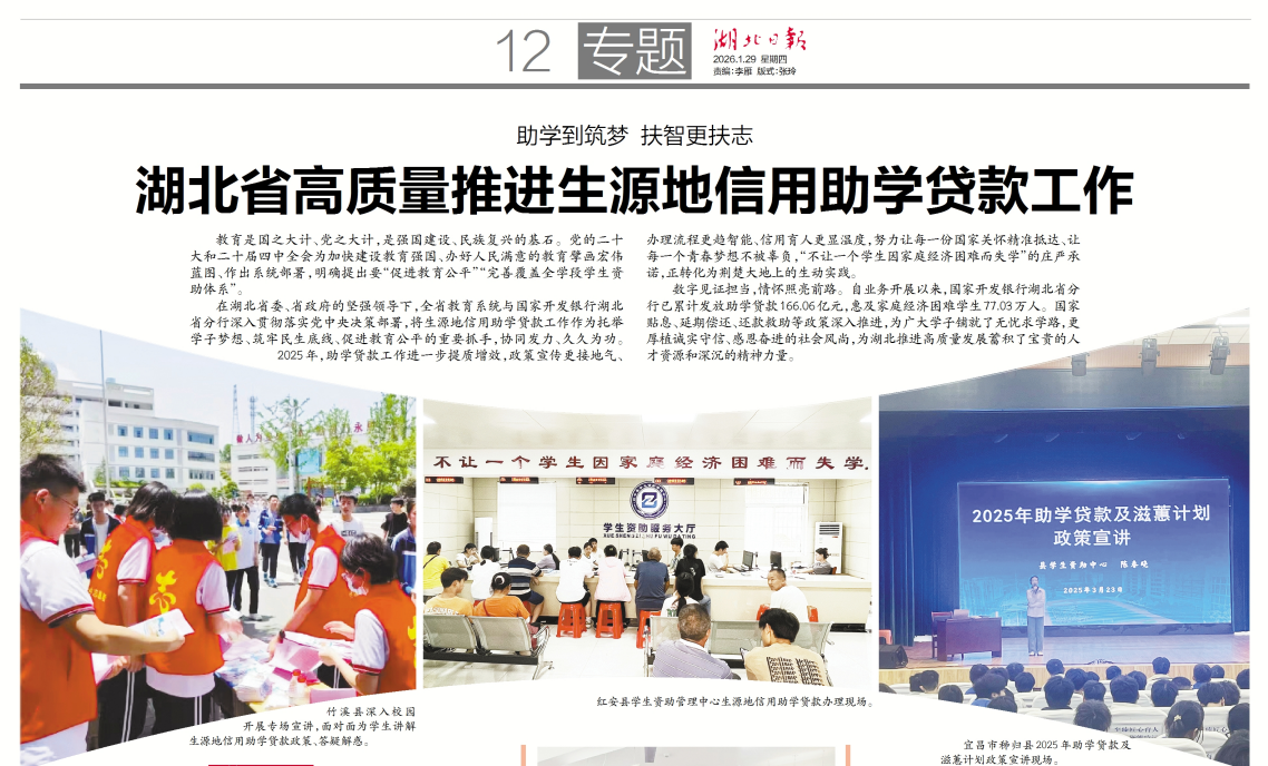 本网讯(通讯员 王正)近日,湖北医药学院资助育人工作再传捷报:学校生源地信用助学贷款在《湖北日报》报道推广,学校起草的《湖北省国家奖学金表格填写及系统填报工作指南》被列为工作样板供全省高校借鉴执行,校资助中心王正老师被聘为湖北省国家奖学金评审小组专家。资助工作经验接连获省资助中心认可,彰显了学校在资助工作中深耕细作、守正创新的扎实成效。